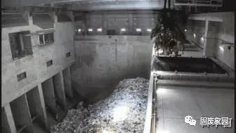 稱完重量的垃圾車來到卸貨中心按順序把垃圾倒入垃圾處理坑。