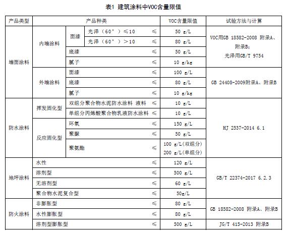 建筑涂料中VOC含量限值應(yīng)符合表1的規(guī)定。