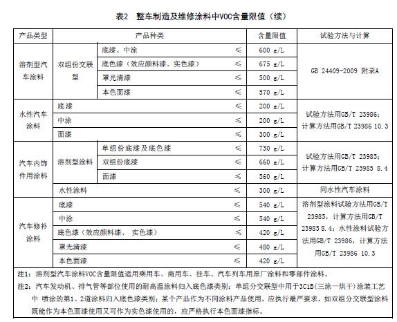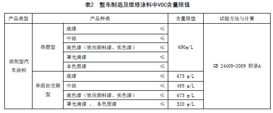 整車制造及維修涂料中VOC含量限值應(yīng)符合表2的規(guī)定。