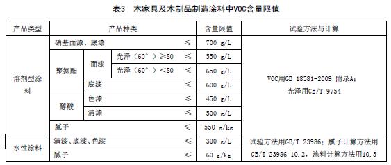 木家具及木制品制造涂料中VOC含量限值應(yīng)符合表3的規(guī)定。