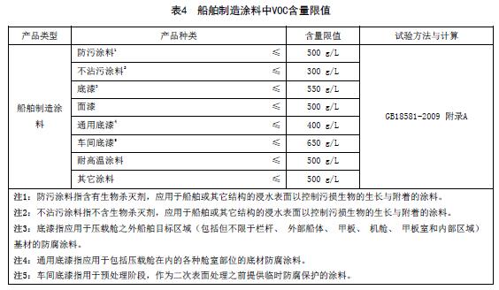 船舶制造涂料中VOC含量限值應(yīng)符合表4的規(guī)定。