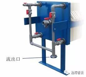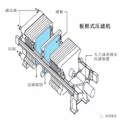 從壓濾機的示意圖可以看到,板框式壓濾機是由一張張濾板疊加而成的,濾板之間是有空間的,污泥注入這個濾板之間后,通過人工或者液壓的壓濾裝置,把污泥中的水分?jǐn)D壓出去,形成泥餅,擠壓出來的過濾液通過濾板上設(shè)置的濾出液管流出板框壓濾機外。