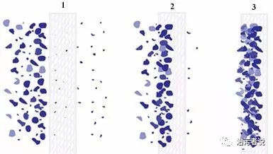 在板框式壓濾機運行過程中,污泥泵把加過藥劑(調(diào)理劑、脫水劑)的污泥送到壓濾機內(nèi),將污泥泥漿在壓濾機內(nèi)均勻地分布。這部分污泥固體開始在濾布上進行堆積,并開始初步的過濾。加藥后的污泥中大部分的泥水分離的是通過在板框之間濾布堆積過程中完成的。起初一些污泥的細(xì)小細(xì)??梢源┻^濾布(如圖1),但越來越多和越來越大的固體開始在濾布過濾過程中被攔截下來,攔截下來的上的的污泥層(如圖2)很像一個預(yù)涂層。該層捕集微粒并形成濾餅(如圖3)。
