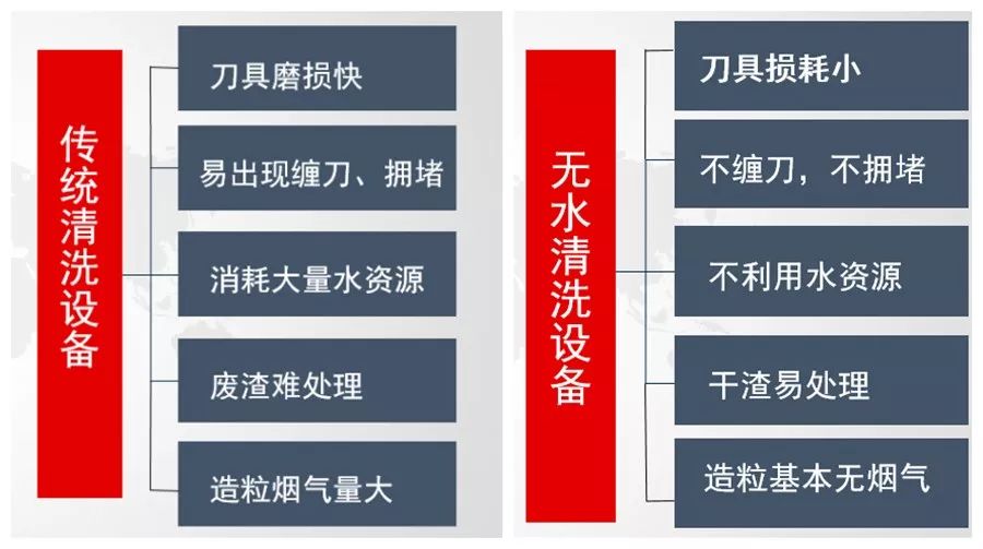 與傳統(tǒng)工藝對(duì)比,無水清洗技術(shù)無須水,所以水處理的費(fèi)用是無。整個(gè)在生產(chǎn)過程中沒有臟水的產(chǎn)生,泥沙和其他的雜質(zhì)集中收集,生產(chǎn)過程中沒有粉塵。不算人工和房租,一噸料的成本是532元,相對(duì)以前兩個(gè)工藝,都有減少。