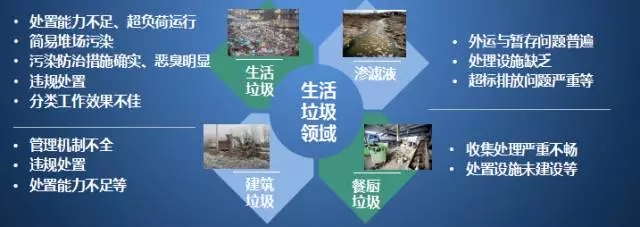 2016.1.4至2017.5.28三批中央環(huán)保督察工作中暴露了環(huán)衛(wèi)領域存在問題:生活垃圾處理設施不足/違規(guī)處置/隨意傾倒嚴重、簡易垃圾填埋場存在、滲濾液偷排或超標排放嚴重、建筑垃圾管理不善、生活垃圾分類工作滯后和臭氣擾民等。