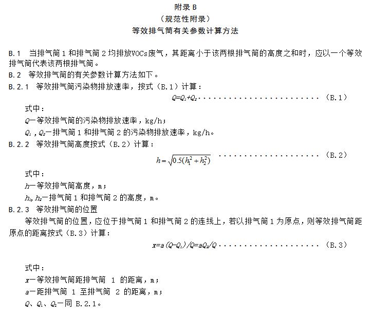 4.3.3.3兩個(gè)排放相同污染物的排氣筒,若其距離小于其幾何高度之和,應(yīng)合并視為一根等效排氣筒。若有三根以上的近距排氣筒,且排放同一種污染物,應(yīng)以前兩根的等效排氣筒,依次與第三、第四根排氣筒取等效值。等效排氣筒的有關(guān)參數(shù)計(jì)算方法參照附錄B。