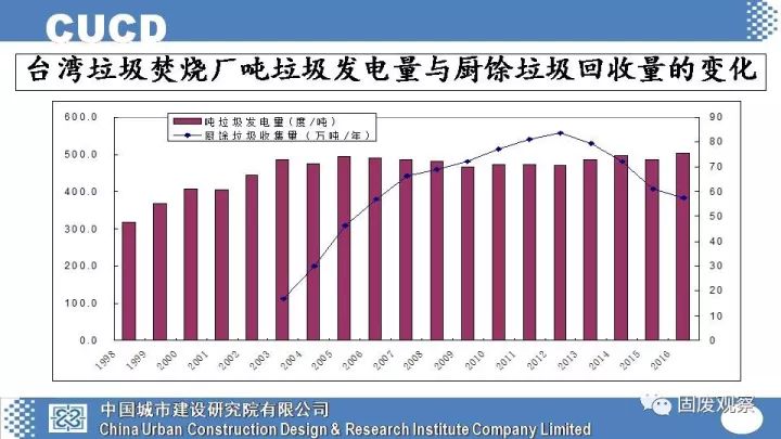 下面這張圖可以看出臺灣地區(qū)的廚余回收量的變化對焚燒發(fā)電效率的影響基本沒有。臺灣地區(qū)雖然聲稱廚余垃圾分類收集做得好,但廚余垃圾的回收利用要明顯落后,臺灣第一個廚余垃圾厭氧處理廠今年才動工,計劃2018年底才能投入運營。