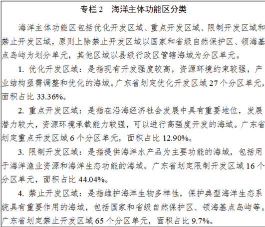 對(duì)海洋限制開發(fā)區(qū)域,相應(yīng)陸域禁止開展對(duì)海洋生態(tài)有較大影響的開發(fā)活動(dòng)。海洋限制開發(fā)區(qū)域包括海洋漁業(yè)保障區(qū)和重點(diǎn)海洋生態(tài)功能區(qū)。限制陸域開發(fā)利用活動(dòng),持續(xù)推進(jìn)陸域污染防治,實(shí)施污染物達(dá)標(biāo)入海,保護(hù)海洋生態(tài)環(huán)境。為保持海陸主體功能銜接一致,調(diào)整相接陸域生態(tài)和生活空間,涉及面積5941平方千米。