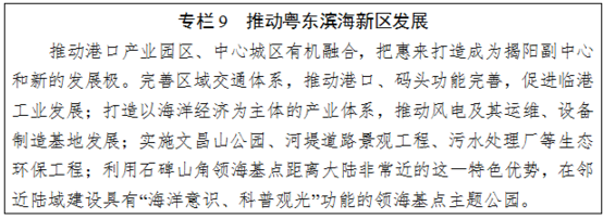 城市發(fā)展。中心城區(qū)以空港新城、揭東新城為重點(diǎn),加快產(chǎn)業(yè)集聚和設(shè)施完善,提升承載力和輻射力;惠來以大南海石化區(qū)建設(shè)為重點(diǎn),促進(jìn)產(chǎn)城融合發(fā)展;推動(dòng)粵東濱海新區(qū)發(fā)展,打造揭陽(yáng)城市副中心。
