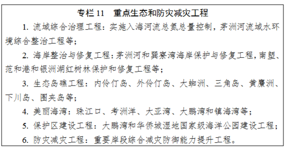灣區(qū)重點(diǎn)開展吳川砂質(zhì)海岸保護(hù)與修復(fù)工程、廉州灣、湛江港、南三島紅樹林、徐聞珊瑚礁保護(hù)與修復(fù)工程;推進(jìn)南三島生態(tài)島礁工程和湛江港、雷州灣、安鋪港美麗海灣建設(shè);開展特呈島和雷州烏石國(guó)家級(jí)海洋公園建設(shè)和湛江東海島石化基地海洋災(zāi)害防御能力提升工程。