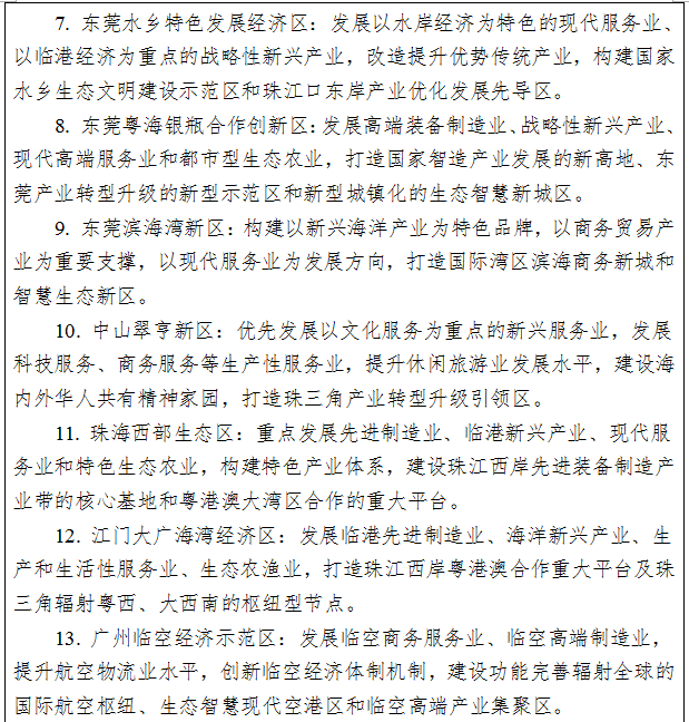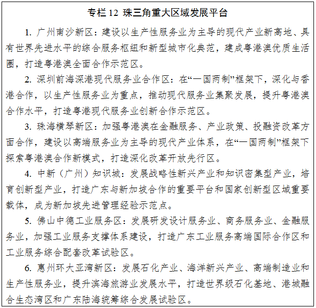 產(chǎn)業(yè)發(fā)展。積極落實(shí)粵港澳大灣區(qū)發(fā)展戰(zhàn)略,發(fā)揮深圳、廣州龍頭帶動(dòng)作用,大力推進(jìn)廣深科技創(chuàng)新走廊建設(shè),形成高度發(fā)達(dá)的創(chuàng)新經(jīng)濟(jì)帶,輻射帶動(dòng)全省創(chuàng)新發(fā)展。打造全球產(chǎn)業(yè)創(chuàng)新高地,建設(shè)具有國(guó)際影響力的戰(zhàn)略性新興產(chǎn)業(yè)高地、信息經(jīng)濟(jì)高地、智能制造高地,重點(diǎn)布局在深圳、廣州、珠海等地。建設(shè)世界級(jí)先進(jìn)的電子信息、裝備制造、石化等產(chǎn)業(yè)基地,重點(diǎn)布局在佛山、惠州、東莞、中山、江門等。重點(diǎn)打造全球金融中心、全球貿(mào)易中心、全球物流中心、國(guó)際化的消費(fèi)中心、世界休閑旅游中心,主要布局在廣州、深圳。大力發(fā)展廣深珠高端制造業(yè),支持珠海培育智能制造和戰(zhàn)略性新興產(chǎn)業(yè),帶動(dòng)珠江西岸產(chǎn)業(yè)發(fā)展。大力建設(shè)佛山和東莞科技成果轉(zhuǎn)化基地。建設(shè)惠州、中山、江門等區(qū)域生產(chǎn)制造基地。加快構(gòu)筑區(qū)域發(fā)展重大平臺(tái)。建設(shè)南海油氣資源勘探開發(fā)保障基地,加快推進(jìn)天然氣水合物產(chǎn)業(yè)發(fā)展;推動(dòng)江門循環(huán)經(jīng)濟(jì)和環(huán)保產(chǎn)業(yè)示范區(qū)建設(shè);在港口、桂山、金灣等海域發(fā)展海上風(fēng)電。