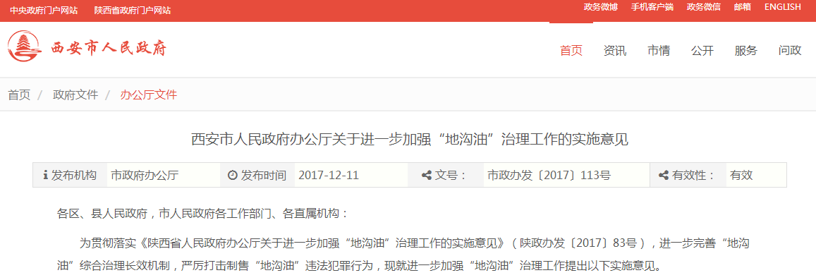 近日,西安市人民政府辦公廳印發(fā)《西安市人民政府辦公廳關(guān)于進(jìn)一步加強(qiáng)“地溝油”治理工作的實(shí)施意見(jiàn)》,針對(duì)餐廚廢棄物違法排放、收集、運(yùn)輸、加工、銷(xiāo)售、使用等各個(gè)環(huán)節(jié),嚴(yán)厲打擊“地溝油”加工銷(xiāo)售的違法犯罪行為。堅(jiān)持“標(biāo)本兼治,著力治本,建立長(zhǎng)效機(jī)制”的工作方針,將專(zhuān)項(xiàng)行動(dòng)與日常監(jiān)管相結(jié)合、集中治理與制度建設(shè)相結(jié)合、嚴(yán)格執(zhí)法與科學(xué)管理相結(jié)合,實(shí)行科學(xué)化、規(guī)范化、法制化管理,促進(jìn)全市餐廚廢棄物無(wú)害化處理健康有序發(fā)展,切實(shí)保障人民群眾身體健康和生命安全。政策全文如下: