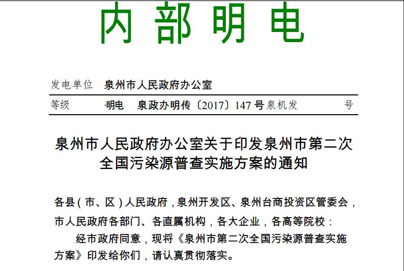泉州市人民政府辦公室關(guān)于印發(fā)泉州市第二次全國(guó)污染源普查實(shí)施方案的通知