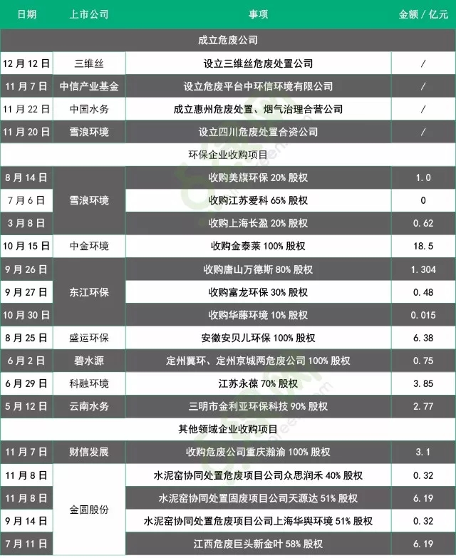 據(jù)不完全統(tǒng)計(jì),環(huán)保企業(yè)共發(fā)生了11起危廢公司的收購(gòu)事項(xiàng)。其中,雪浪環(huán)境和東江環(huán)保共發(fā)生3起。