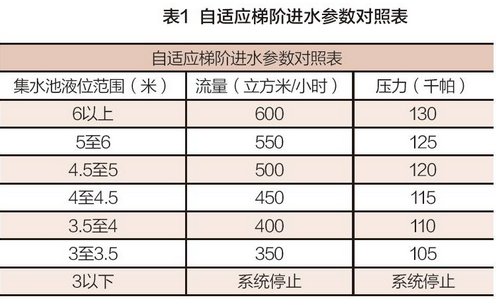 表1是本系統(tǒng)中梯階自適應(yīng)液位與流量壓力的參數(shù)對照表。這里的壓力與流量是對應(yīng)的,其壓力是根據(jù)膜的參數(shù)信息進(jìn)行對照查詢所得。液位與流量則是通過粗略計算和實(shí)驗(yàn)矯正所得。當(dāng)集水池液位大于6米時,存在溢出風(fēng)險,這個時候系統(tǒng)滿負(fù)荷運(yùn)行。當(dāng)?shù)陀?米時,為了防止提升泵干抽,我們將停止系統(tǒng)運(yùn)轉(zhuǎn)。