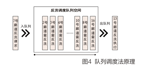 這里我們采用隊(duì)列法來處理廊道競爭問題。隊(duì)列法是一種遵循先進(jìn)先出原則的調(diào)度方法。具體原理如圖4所示。隊(duì)列調(diào)度由入隊(duì)列、出隊(duì)列和調(diào)度隊(duì)列空間三部分組成。入隊(duì)列是根據(jù)廊道反洗請求情況將有反洗需求的廊道壓入到隊(duì)列空間的過程。出隊(duì)列則是根據(jù)當(dāng)前的反洗設(shè)備的運(yùn)行狀況將需要反洗的廊道彈出隊(duì)列的過程。反洗調(diào)度隊(duì)列空間即扮演一個存儲調(diào)度序列的角色,同時其還具有優(yōu)化和排布序列的功能。