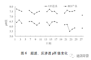 由圖 6 可以看出,隨著超濾進(jìn)水 pH 值的逐步降低,其產(chǎn)水pH值亦隨之變化。當(dāng)進(jìn)水 pH 值在 7.1~7.8 左右時(shí),反滲透產(chǎn)水的 pH 值在 5.8~6.5 之間波動(dòng)。綜合來(lái)看,經(jīng)過(guò)反滲透處理后pH 值降低約一個(gè)單位,有時(shí)會(huì)低于 6.0。為了保證后續(xù)用水點(diǎn)水質(zhì)的穩(wěn)定,避免輸送管路腐蝕,可通過(guò)在產(chǎn)水中添加氫氧化鈉對(duì)pH 值進(jìn)行調(diào)整,調(diào)整后回用水的 pH 值范圍為6.0~9.0。