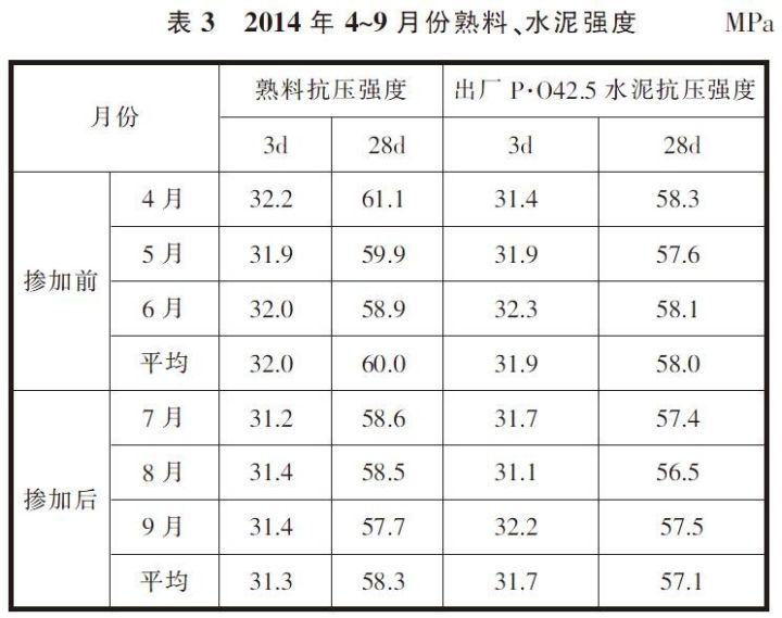 在生料中摻加污染土壤,造成生料易燒性的變化和有害成分的增加,對窯系統(tǒng)帶來一系列的不利影響,進而導致熟料強度尤其是28d強度出現(xiàn)明顯下滑,同時對水泥強度尤其是28d抗壓強度造成一定影響,具體數(shù)據(jù)見表3。