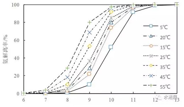 實(shí)際城市污水略偏堿性。如果取pH=7.5、溫度=20 ℃計(jì)算氨離解率,理論值僅為1.3%。這就注定工程應(yīng)用時(shí)需要投加大量堿性試劑,以調(diào)節(jié)pH。圖2顯示,當(dāng)pH由9.0上升到10.0時(shí),氨離解率從28.6%一下竄升至80.1%。然而,此時(shí)藥劑投加量增加近似10倍,會(huì)導(dǎo)致化學(xué)藥劑成本過(guò)高。因此,在實(shí)踐中一般只調(diào)節(jié)pH至9.0,然后再通過(guò)升溫方式來(lái)提高氨解離率;溫度從20 ℃提高到55 ℃,氨離解率亦可達(dá)80.2%。換句話說(shuō),以較低的電能消耗來(lái)彌補(bǔ)大量藥劑投入的不足,盡可能節(jié)約氨離解率過(guò)程經(jīng)濟(jì)成本。然而,即使被離解出的游離態(tài)NH3仍需要空氣或水蒸氣吹脫才能逸散出來(lái),在經(jīng)過(guò)二次處理(吸收劑或工廠再生產(chǎn))后方可成為肥料制作原料。
