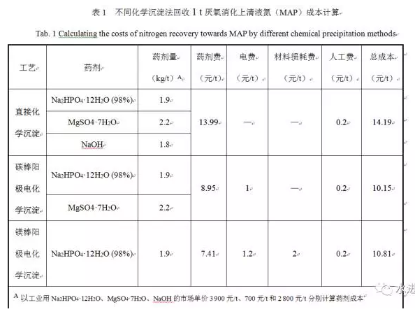采用鳥糞石結(jié)晶方式回收氮受環(huán)境影響因素較大,pH、NH4+濃度、溫度以及陽(yáng)離子競(jìng)爭(zhēng)(如Ca2+與Mg2+競(jìng)爭(zhēng))等。我們前期研究表明,獲得較純鳥糞石的pH并非大多文獻(xiàn)述及的堿性條件,而是中性、甚至偏酸性(pH£7.5)環(huán)境[20]。中性以下的pH固然可以獲得較為純凈的鳥糞石,但所需反應(yīng)時(shí)間甚長(zhǎng),需要以催化方式(如,電化學(xué)沉積法[20])加速反應(yīng),這勢(shì)必增加回收技術(shù)的復(fù)雜程度。事實(shí)上,鳥糞石回收主要針對(duì)磷的回收,氮只不過(guò)是順帶“夾裹”而已。即使是針對(duì)鳥糞石回收磷,如果采用電化學(xué)沉積這樣的結(jié)晶法,其生產(chǎn)成本也是極高的。以回收鳥糞石為目的,處理并100%回收1 t NH4+濃度為106.1 mg N/L、PO43-濃度為37. 2 mg P/L厭氧消化上清液,不同工藝反應(yīng)、回收成本計(jì)算見表1;折算后直接化學(xué)沉淀法成本約為163元/kg N,碳棒陽(yáng)極電化學(xué)沉淀為117元/kg N,鎂棒陽(yáng)極電化學(xué)沉淀為124元/kg N。