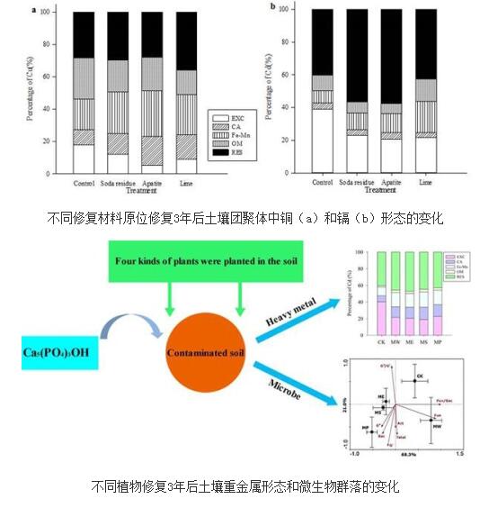 在不同修復材料同種修復植物試驗中,向土壤中施加含微米羥基磷灰石修復材料、堿渣、石灰等不同修復材料,種植海州香薷作為修復植物,土壤和土壤團聚體中鎘和銅的生物可利用態(tài)含量均顯著降低,且這3種修復材料均能顯著增加土壤干、濕團聚體的穩(wěn)定性;在土壤團聚體重金屬鎘、銅總量分布中,粒徑<0.053mm的團聚體銅和鎘濃度最高,在0.053-0.25mm和0.25-2mm的土壤團聚體中銅和鎘的質(zhì)量負載量最高。材料修復土壤中的銅、鎘形態(tài)變化是因為重金屬鎘、銅離子由可交換態(tài)轉(zhuǎn)化為穩(wěn)定態(tài)。試驗中發(fā)現(xiàn)土壤團聚體中的重金屬含量與團聚體的粒徑相關(guān),也與土壤團聚體中的有機碳顯著相關(guān)。
