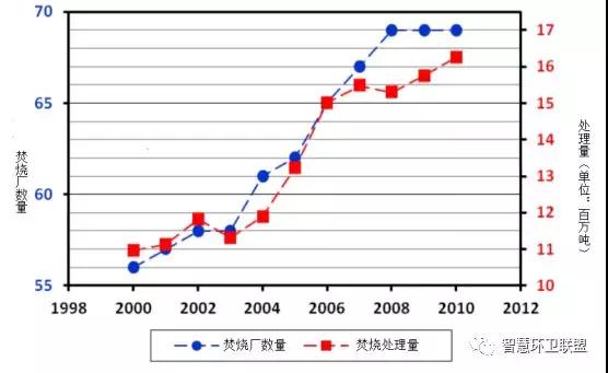 圖6.德國焚燒廠數(shù)量及焚燒處理量隨時(shí)間的變化
