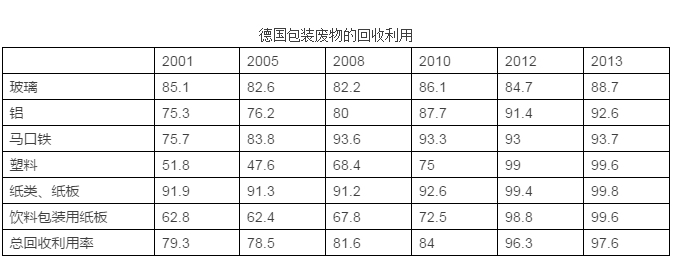 在德國,最常見的包裝材料有玻璃、鋁、馬口鐵、塑料、紙、紙板、木材,全部都能夠被用作二次原料,從而減少對原生原料的需求,可以起到降低能源消耗及污染排放的作用。根據(jù)《包裝條例》的規(guī)定,居民應(yīng)當(dāng)對包裝廢物進(jìn)行分類投放。條例獲得了廣泛的公眾支持,2013年時(shí)德國包裝廢物的回收利用率達(dá)到了97%。