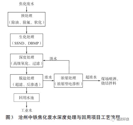 2.3.1 項(xiàng)目概況項(xiàng)目名稱:滄州中鐵-河北豐凱節(jié)能科技有限公司焦化廢水深度處理與回用項(xiàng)目。設(shè)計(jì)規(guī)模:總水量360 m3/h,其中蒸氨廢水96 m3/h、低濃度焦化廢水64 m3/h、LNG 生產(chǎn)排水40 m3/h 和循環(huán)排污水160 m3/h。原有工藝:無。業(yè)主要求:產(chǎn)水直接回用于工業(yè)水系統(tǒng),因?yàn)闃I(yè)主將對以各種水源制取的工業(yè)水進(jìn)行統(tǒng)一調(diào)配,產(chǎn)水水質(zhì)要求達(dá)到以新水為水源制取工業(yè)水的標(biāo)準(zhǔn);業(yè)主對濃水的消納量有限,要求回收率≥90%。 2.3.2處理工藝:根據(jù)業(yè)主對新建焦化廢水深度處理回用系統(tǒng)的要求,既要高于90%的回收率,又要優(yōu)良的產(chǎn)水水質(zhì),這在國內(nèi)的所有焦化企業(yè)中并無先例。為了應(yīng)對這一挑戰(zhàn),單一技術(shù)環(huán)節(jié)的突破不能解決全部問題,必須對全流程的工藝系統(tǒng)進(jìn)行整體優(yōu)化,充分發(fā)揮每個(gè)工藝單元的優(yōu)勢,才有可能取得實(shí)質(zhì)性成功。滄州中鐵焦化廢水深度處理與回用項(xiàng)目工藝流程如圖3所示。