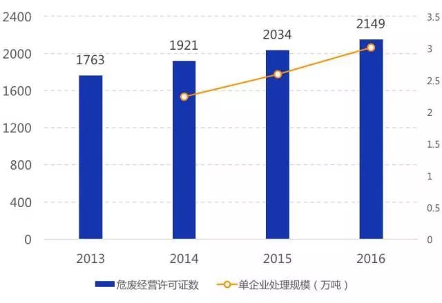 資質(zhì)企業(yè)平均規(guī)模較?。?016年我國(guó)持危險(xiǎn)廢棄物經(jīng)營(yíng)許可證的企業(yè)數(shù)量為2149家,2016年凈增加僅115家,體現(xiàn)出環(huán)保系統(tǒng)對(duì)新頒發(fā)許可證愈發(fā)謹(jǐn)慎;平均每家處理量?jī)H不到3萬噸,呈現(xiàn)較強(qiáng)的分散性特征,但單企業(yè)處理規(guī)模由2014年2.2萬噸/年增加到2016年3.0萬噸/年,未來隨著許可證頒發(fā)與復(fù)核難度加大,實(shí)力弱、技術(shù)差的小企業(yè)將被淘汰出市場(chǎng),龍頭擴(kuò)張,單企業(yè)規(guī)模繼續(xù)擴(kuò)大。
