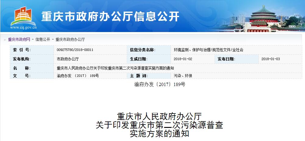 關于印發(fā)重慶市第二次污染源普查實施方案的通知