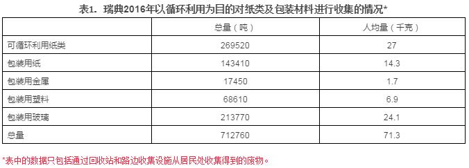 2016年時(shí),瑞典總共循環(huán)利用了161.517萬噸的生活垃圾,相當(dāng)于每人每年162千克,與2015年相比減少了2.3%,減少的主要原因?yàn)榻ㄖ臏p少,包括屋面瓦、纖維玻璃、破損的陶瓷器等。上述對(duì)以循環(huán)利用為目的進(jìn)行的收集量統(tǒng)計(jì),包括居民向生產(chǎn)商建立的循環(huán)利用系統(tǒng)投放的包裝和可循環(huán)利用的紙制品。這一部+