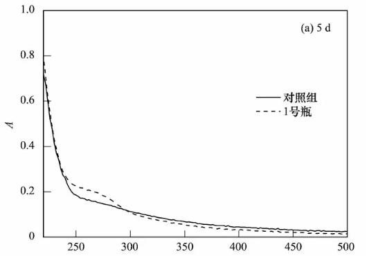 堆肥過程中DOM的變化被認(rèn)為是能靈敏反映堆肥腐熟狀況的重要指標(biāo),與堆肥的固相組分相比更具代表性,因此本實驗采用紫外-可見光譜共堆肥過程中DOM的光譜特征進行了分析,而由前面的實驗結(jié)果可知,1號瓶的整體堆肥效果最佳,因此將1號瓶中的堆體與對照組進行了分析,結(jié)果如圖5所示。