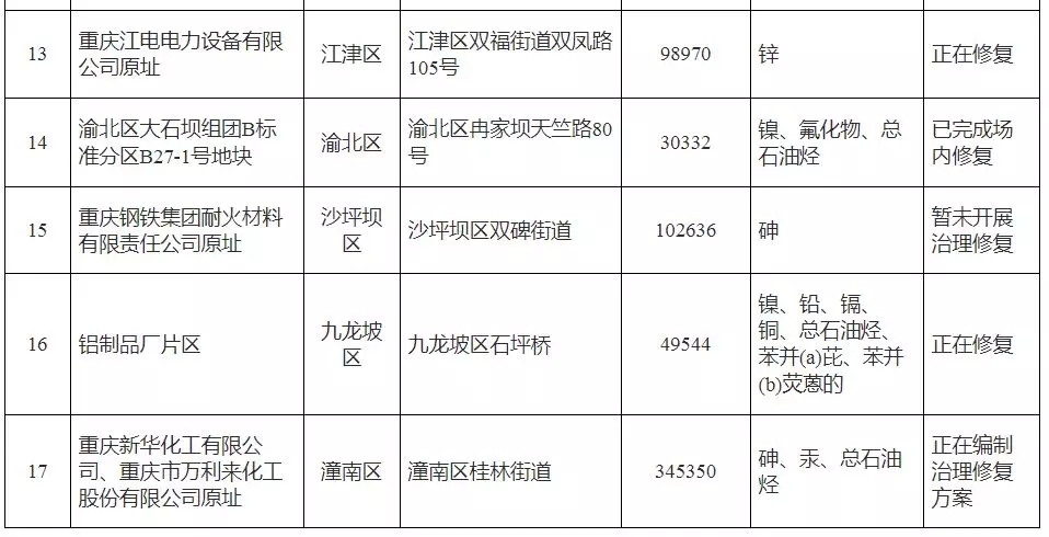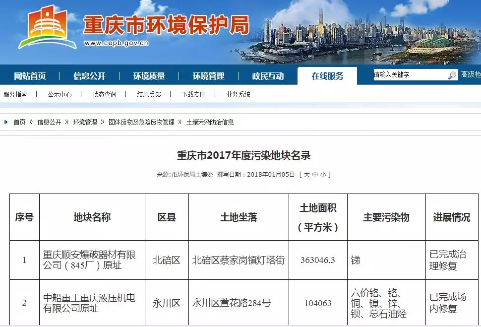 2018年1月5日 重慶市環(huán)境保護(hù)局公布了《重慶市2017年度污染地塊名錄》, 共有17塊污染地塊。