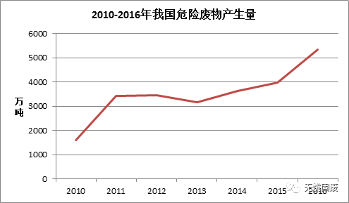 工業(yè)行業(yè)是我國危險廢物的主要來源,根據(jù)2017中國統(tǒng)計年鑒顯示,2016年全國工業(yè)危險廢物產(chǎn)生量為5347.3萬噸,同比增長34.49%。