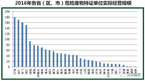 截至2016年,全國危險廢物經(jīng)營持證單位共2195家,核準經(jīng)營規(guī)模達到6471萬噸,平均每家約2.9萬噸。但實際經(jīng)營規(guī)模為1629萬噸,平均每家不足0.75萬噸。實際經(jīng)營規(guī)模排在前三位的分別是浙江、山東和廣東。
