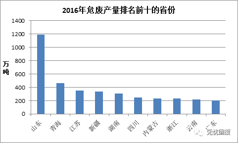 其中山東危廢產(chǎn)生量最多,高達1188.28萬噸,其次是青海,產(chǎn)生量為462.05萬噸,江蘇危廢產(chǎn)生量為350.98萬噸,排名第三。