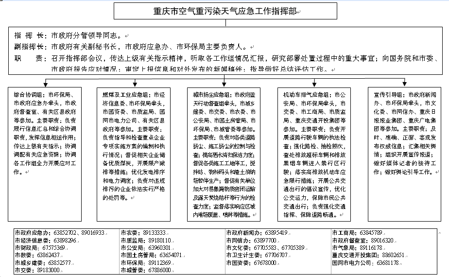 根據工作需要,在重慶市人民政府突發(fā)事件應急委員會統(tǒng)一領導下,成立重慶市空氣重污染天氣應急工作指揮部(以下簡稱市指揮部)。市指揮部實行指揮長負責制,由市政府分管領導同志擔任指揮長,市政府有關副秘書長,市政府應急辦、市環(huán)保局主要負責人任副指揮長,統(tǒng)一領導和組織紅色、橙色預警空氣重污染天氣應對工作。