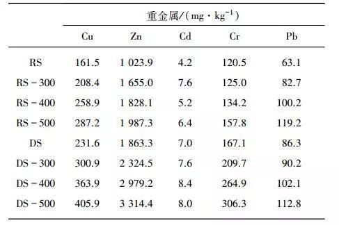 表2為生污泥和消化污泥中Cu、Zn、Cd、Cr、Pb五種重金屬元素總量。由表2可知,污泥中5中重金屬元素含量順序為:Zn>Cu>Cr>Pb>Cd。一般而言我國污泥中含有較高濃度的Zn和Cu,而含有較低濃度的Cd。厭氧消化后污泥中各金屬含量相比原污泥有較大的增長,這也導(dǎo)致同等溫度下消化污泥熱解炭中五種重金屬含量均高于生污泥熱解炭,其中消化污泥熱解炭中重金屬Cr、Zn、Cu約為生污泥熱解炭的1.5倍。