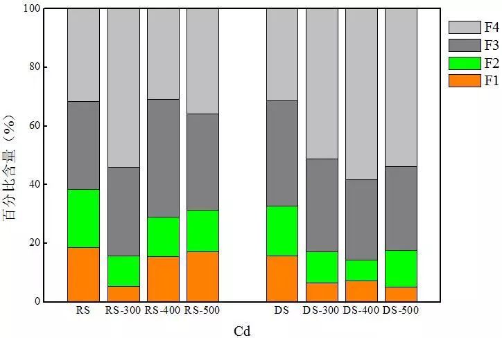 對比兩種熱解炭可以發(fā)現(xiàn),消化污泥熱解炭中非穩(wěn)定態(tài)Cd含量均低于同等溫度下(300 ℃除外)生污泥熱解炭,在400 ℃熱解條件下,DS-400和RS-400非穩(wěn)態(tài)Cd含量分別為14.28%和28.84%,這是因為經(jīng)過厭氧消化后,污泥中非穩(wěn)定態(tài)金屬含量降低,從38.5%降低到32.8%,進(jìn)而影響了熱解炭中Cd的形態(tài)分布。Yang同樣發(fā)現(xiàn)經(jīng)過厭氧消化穩(wěn)定后的污泥中可交換態(tài)Cd含量從34.2%降低到22.5%,厭氧消化能夠降低污泥中Cd的遷移轉(zhuǎn)化能力,進(jìn)而降低了Cd的毒性。