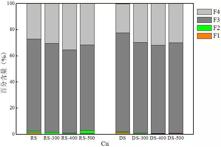 熱解后,兩種熱解炭中非穩(wěn)態(tài)Cu含量均有不同程度的降低,因此可以推斷經(jīng)過熱解后F1和F2態(tài)轉(zhuǎn)化為F3或F4態(tài)。在400 ℃熱解條件下熱解炭中穩(wěn)定態(tài)Cu含量最大,在500 ℃下熱解炭中殘渣態(tài)Cu相對于400 ℃會有小幅度降低,低溫對污泥中Cu的鈍化效果較佳。