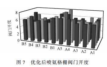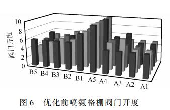 調(diào)前、調(diào)后噴氨格柵閥門開(kāi)度分別見(jiàn)圖6、圖7。