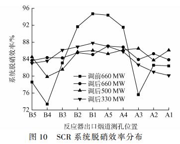 調(diào)后機(jī)組660MW負(fù)荷下,脫硝效率B側(cè)介于83.7%~85.5%,A側(cè)介于83.9%~87.1%,系統(tǒng)平均為85.0%。調(diào)后機(jī)組500MW負(fù)荷下,脫硝效率B側(cè)介于79.8%~86.1%,A側(cè)介于83.8%~86.5%,系統(tǒng)平均為84.6%。調(diào)后機(jī)組330MW負(fù)荷下,脫硝效率B側(cè)介于83.0%~87.8%,A側(cè)介于80.1%~87.0%,系統(tǒng)平均為84.4%。3種工況負(fù)荷下,系統(tǒng)總效率基本與調(diào)前持平,但效率峰谷差異大幅下降。
