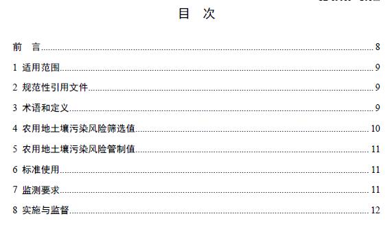 本標(biāo)準(zhǔn)規(guī)定了農(nóng)用地土壤污染風(fēng)險(xiǎn)篩選值和管制值,以及監(jiān)測、實(shí)施與監(jiān)督要求。
