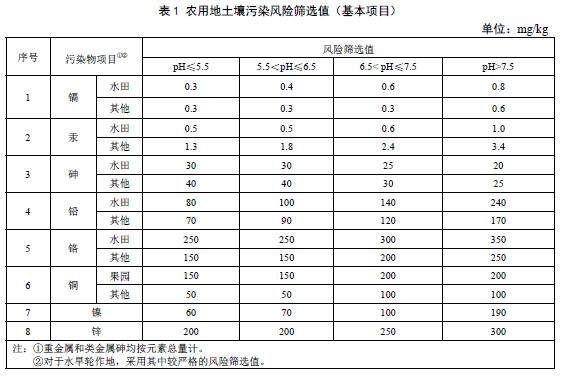——規(guī)定了農(nóng)用地土壤中鎘、汞、砷、鉛、鉻、銅、鎳、鋅等基本項(xiàng)目,以及六六六、滴滴涕、苯并[a]芘等其他項(xiàng)目的風(fēng)險(xiǎn)篩選值;