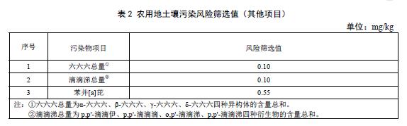 4.2.1農(nóng)用地土壤污染風(fēng)險(xiǎn)篩選值的其他項(xiàng)目為選測項(xiàng)目,包括六六六、滴滴涕和苯并[a]芘,風(fēng)險(xiǎn)篩選值見表2。