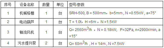 格柵間和污水提升泵房聯(lián)建,室內(nèi)設(shè)置機械格柵1臺。格柵間尺寸為7.5m×4.5m×6.0m ,磚混結(jié)構(gòu)。主要設(shè)備如下表。