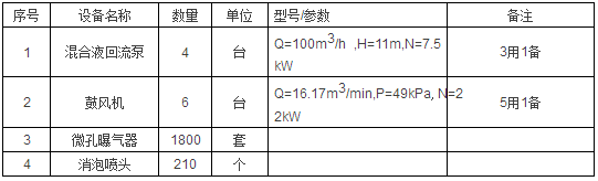 設(shè)計調(diào)節(jié)池1座,水力停留時間22h ,尺寸為25m×10m×6.0m ,有效水深5.5m ,鋼混結(jié)構(gòu)。池內(nèi)主要設(shè)備如下表。