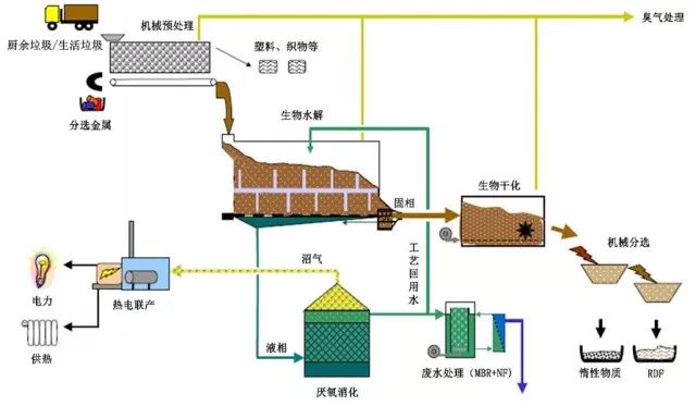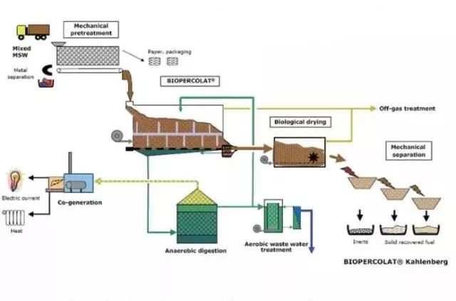 工藝全過(guò)程分為四個(gè)階段:機(jī)械預(yù)處理、淋濾處理 – 整個(gè)處理過(guò)程的核心步驟、生物干化、機(jī)械分選和 RDF 生產(chǎn)。