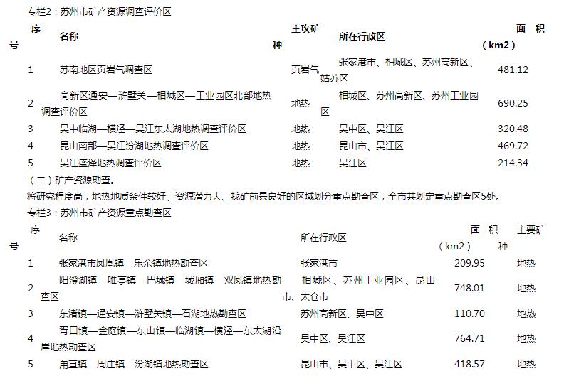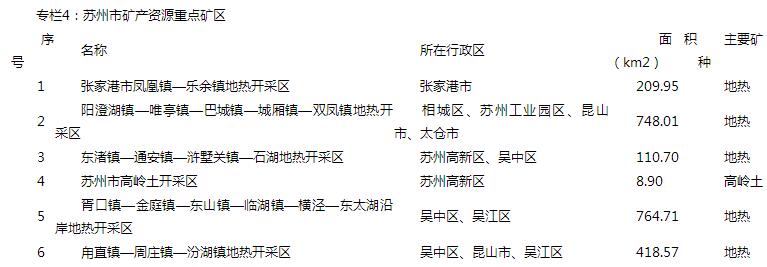 以地熱、高嶺土等蘇州優(yōu)勢特色礦產(chǎn)為主,在張家港市、昆山市、吳中區(qū)、吳江區(qū)、高新區(qū)等資源較為豐富和集中的區(qū)域劃定6個重點礦區(qū)。
