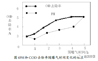 (二)預(yù)曝氣與COD去除的結(jié)果與分析:根據(jù)上述參數(shù)的設(shè)定,對預(yù)曝氣環(huán)節(jié)進(jìn)行測定,其PH和COD去除率會隨著曝氣時間的推移而發(fā)生改變,結(jié)果如圖4所示。